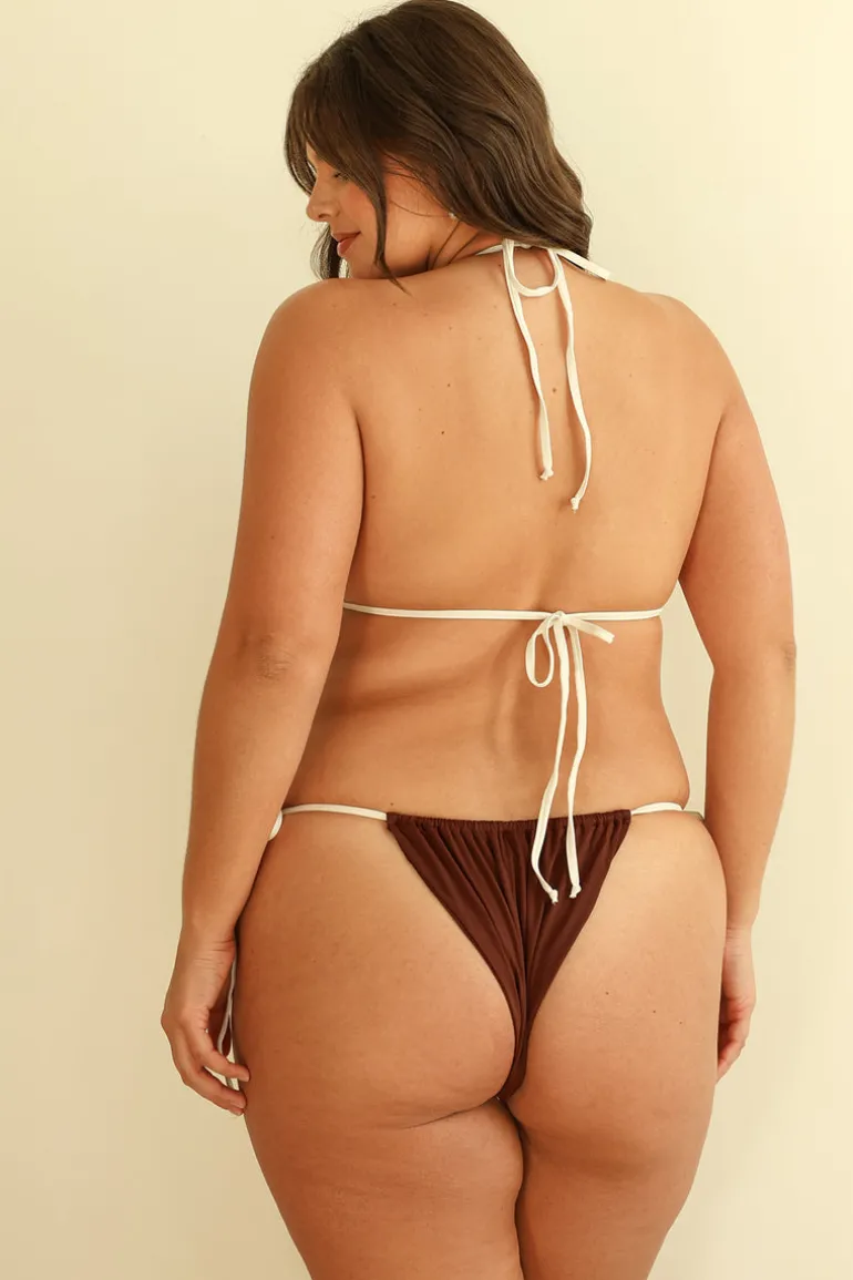 A tried and true triangle-style tie back top featuring mirrored colorblocking on each side. Pairs best with our matching Eve Bottom.
