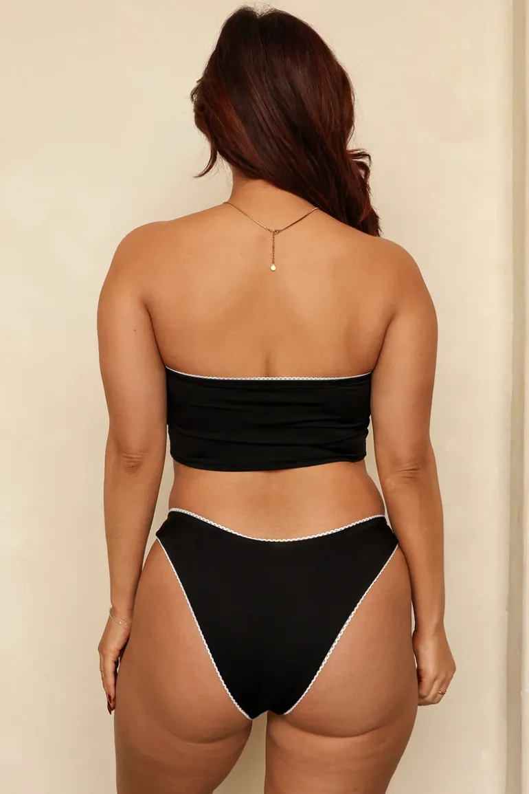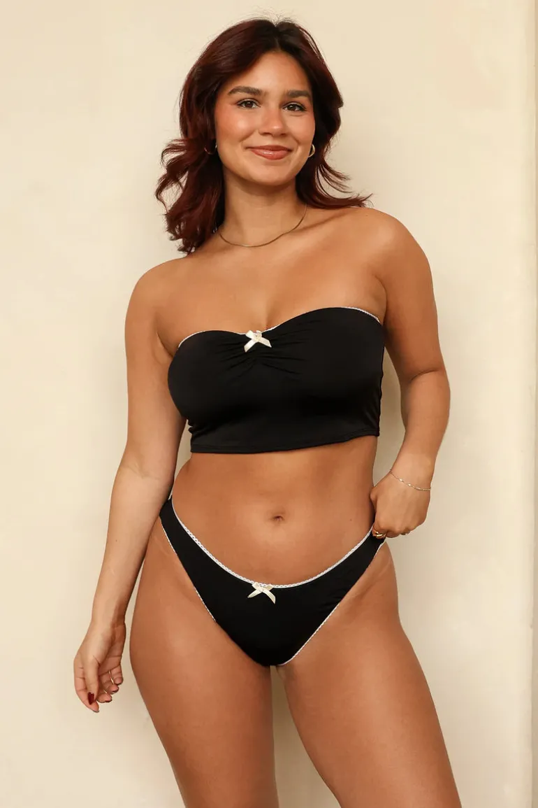 A feminine, bandeau-style tankini top featuring a gorgeous lace trim on the top lining and a mini bow accent at the center. Pairs perfectly with our matching Monet Bottom.