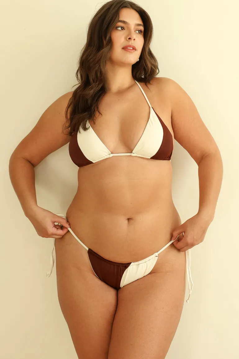 A tried and true triangle-style tie back top featuring mirrored colorblocking on each side. Pairs best with our matching Eve Bottom.