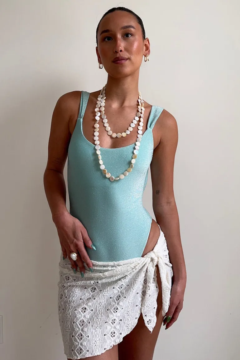 A twist on the classic one piece suit with mini capped sleeves, a high-cut leg silhouette and a scoop back.