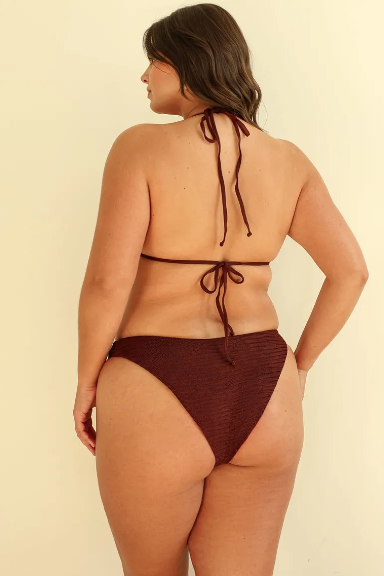 The Mocha Crinkle Triangle Cheeky Set is a sun-ready staple with soft mocha texture and a flattering triangle and cheeky combo made for daily beachwear.