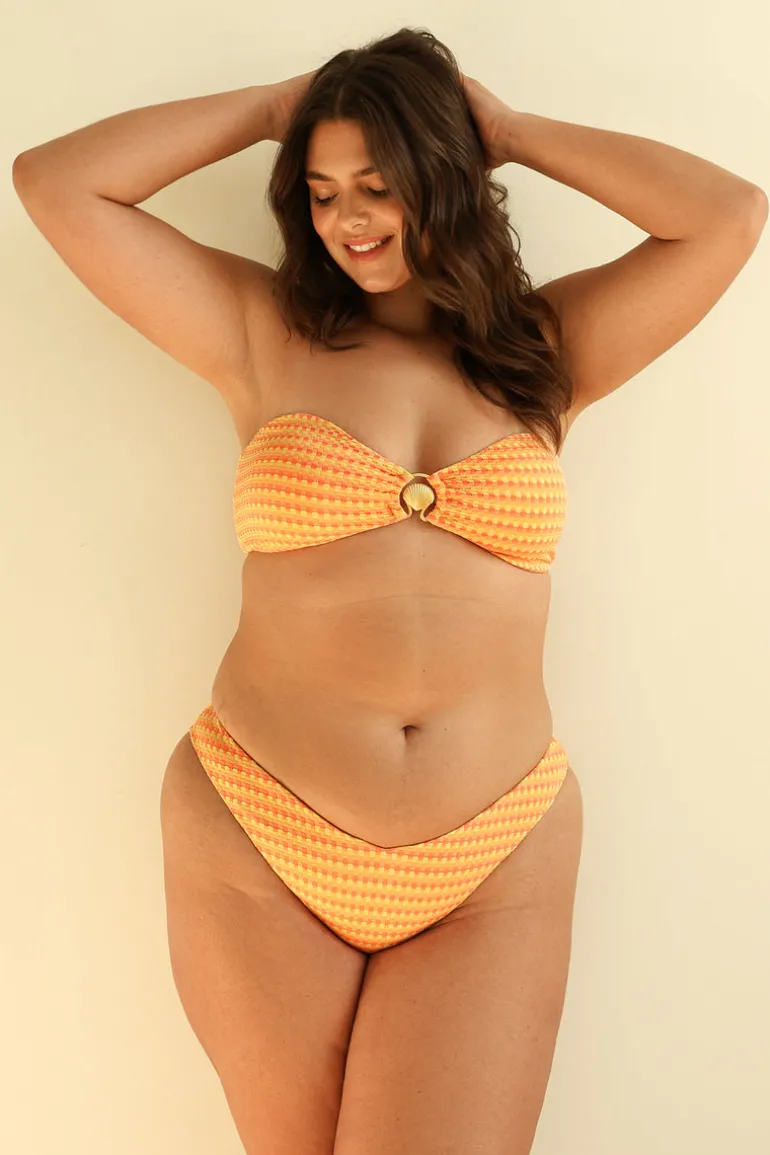 The Morning Glow Triangle Super Cheeky Set features our Palm top in a flattering triangle silhouette and the Mori bottoms in a bold super cheeky cut, all in a striking Morning Glow hue. This set is designed to elevate your look with a blend of modern flair and romantic detail—perfect for confident moments or dreamy escapes.