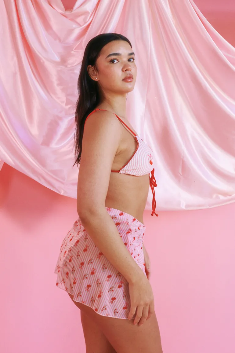 The Nomad Sarong is the perfect cover up wrap skirt, with a high slit and side tie wrap. Matches with any suit in our Cheeky Cherry print.