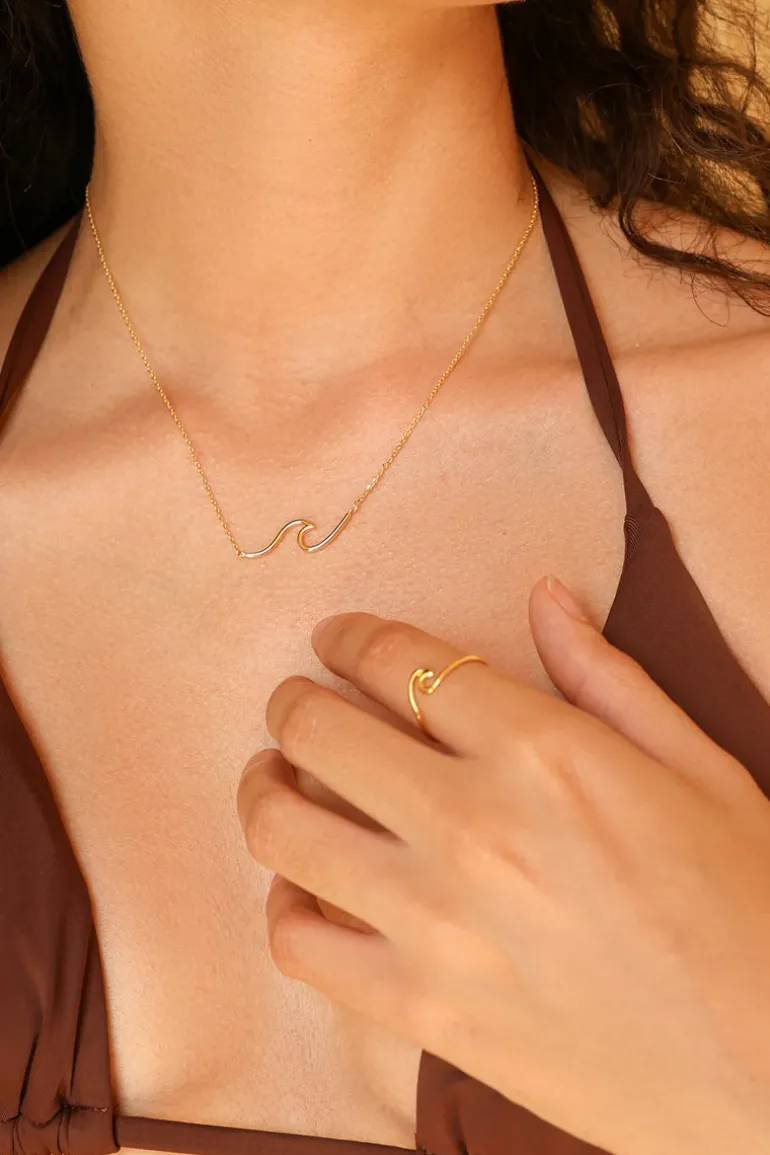 A classic and minimalist gold chain featuring a wave charm at the center.
