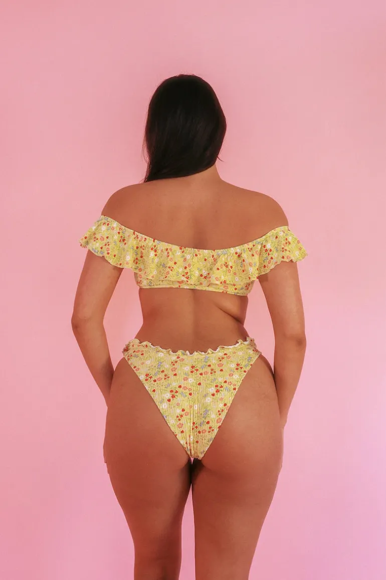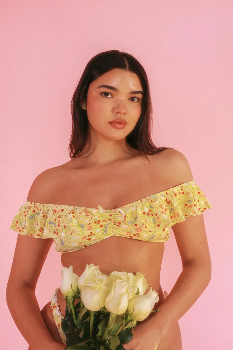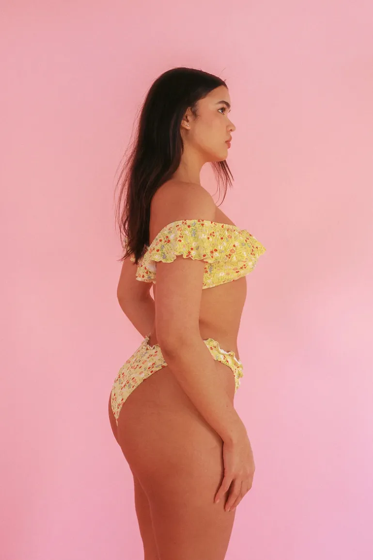 A girly, ruffled off-the-shoulder bikini top designed with a flattering scrunch detail at the front. Pairs well with our matching Byron Bottom.