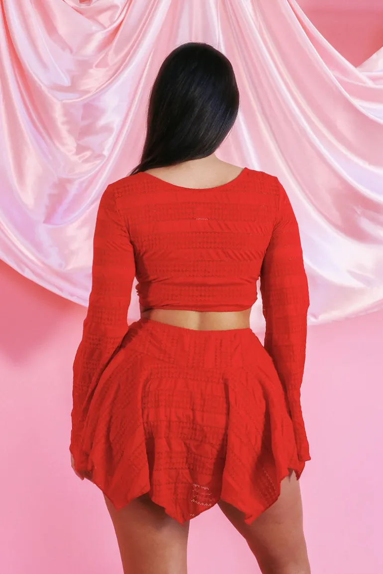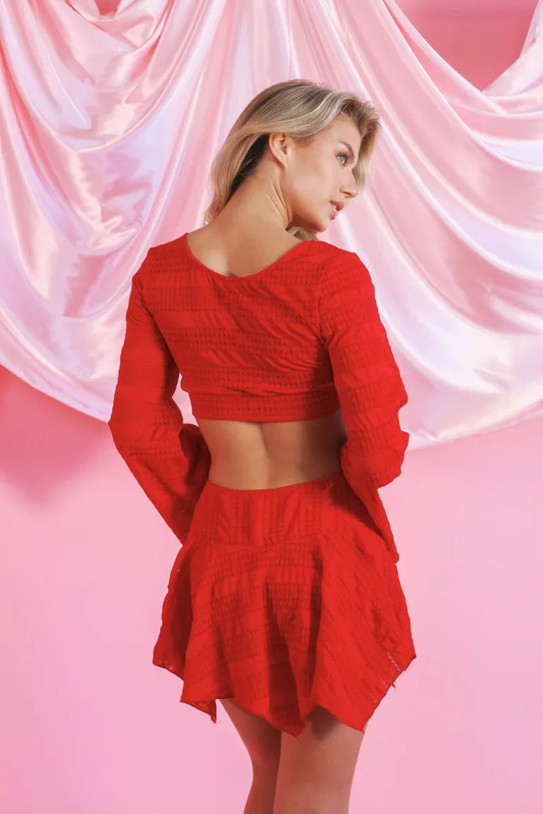 A long-sleeve, cropped tie top with ruffled sleeves designed in a gorgeous red lace-y fabric. Pairs perfectly with our Trullo Miniskirt.